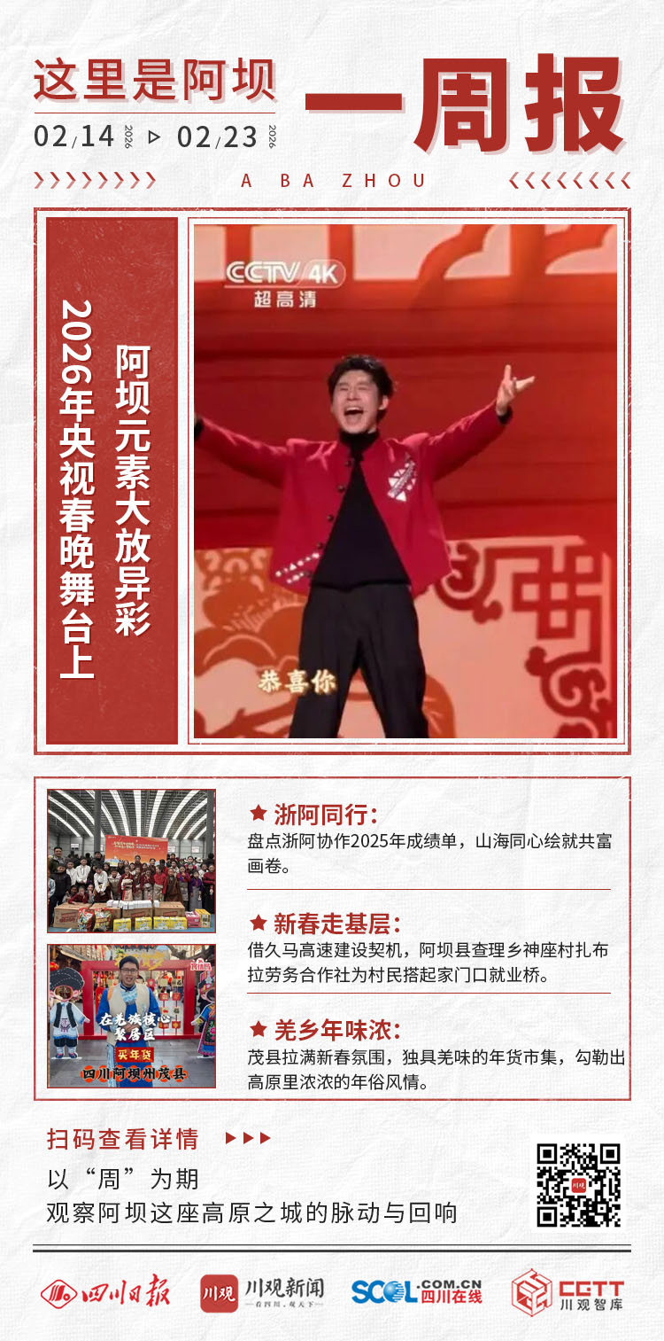 2月14日至2月23日,迎来传统节日春节。2026年央视春晚舞台上,阿坝元素大放异彩,茂县羌族歌手王饼、羌族小朋友瓦依姊亮相不同节目;源自阿坝小金县的“中砧1号”苹果也登上春晚,这是从原生于小金县的苹果资源中筛选出“小金海棠”,并将其作为亲本培育而成的品种,填补我国苹果矮化自根砧空白,成为西部苹果优生区的“中国根”。