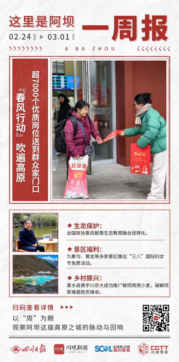 2月24日至3月1日,是农历春节大假后的第一周,大家的工作又开始匆忙起来。农历新春的春风里,阿坝州2026年“春风行动”持续走深走实。全州线上线下联动推出超7000个优质岗位,开展多场招聘活动,黑水、金川等县举办专场招聘会,若尔盖、黑水开通返岗专车专机,实现“出家门、上车门、进厂门”无缝衔接,全方位护航群众稳岗增收。