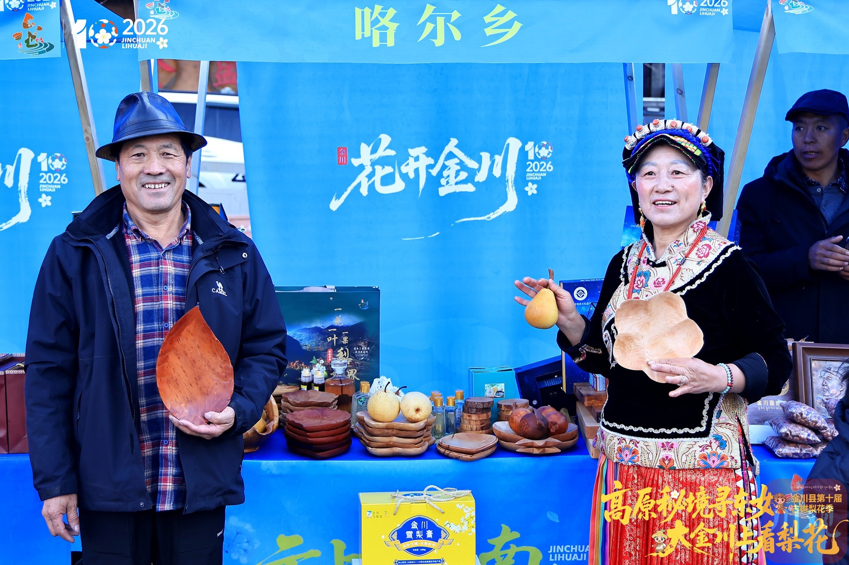 文艺展演之外,舞台一侧的农特产品展销区同样热闹。 雪梨汁、雪梨膏等金川特色农品摆成长龙,从台口一直延伸到门口,各乡镇纷纷拿出自家的“看家”好物,让游客在观演之余,也尝到了地道的金川味道。
