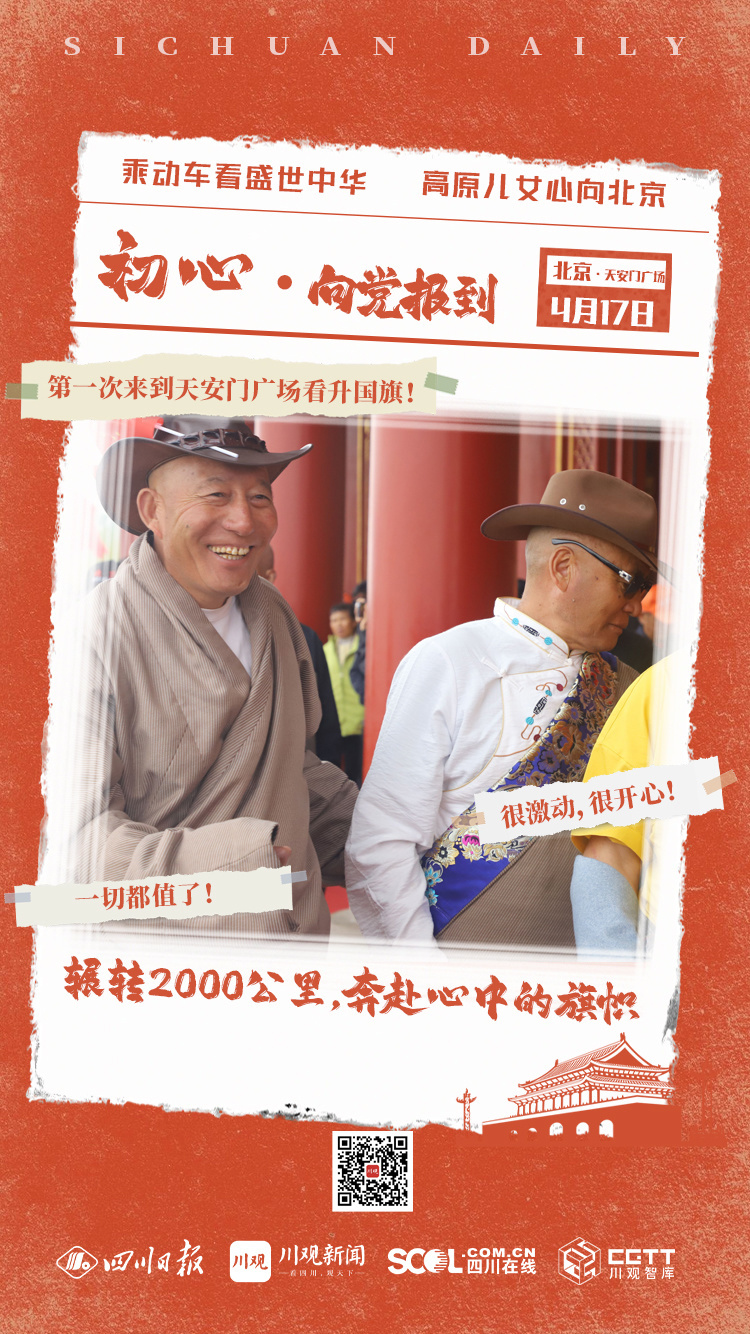 从革命老区松潘县坐动车到首都北京看升国旗仪式,行程约2000公里,在高原奉献了青春的老支书们得偿心中夙愿。
