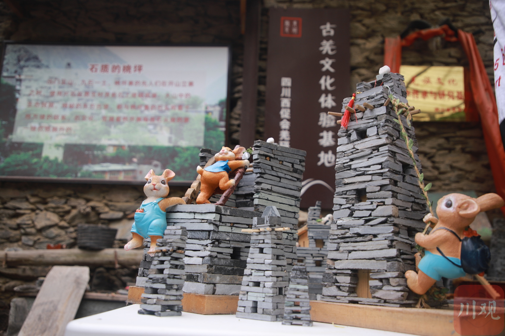 一处院坝,一把钳子、一罐片石、一根胶棒,就是手工碉楼的原材料。“修简易版的手工碉楼也不难,就像搭积木,一层一层垒上去。”贾学友和女儿杨天琼相互协作,一人教,一人讲,尝试起教小朋友修碉楼。