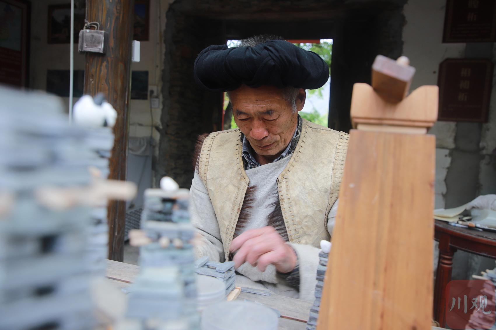 4月22日午后,理县桃坪羌寨的一处院坝里,73岁的贾学友摆弄着一堆石头。“这些都是从山上找来的片石,一罐一罐装好,用来教来研学的小朋友做手工羌碉。”
